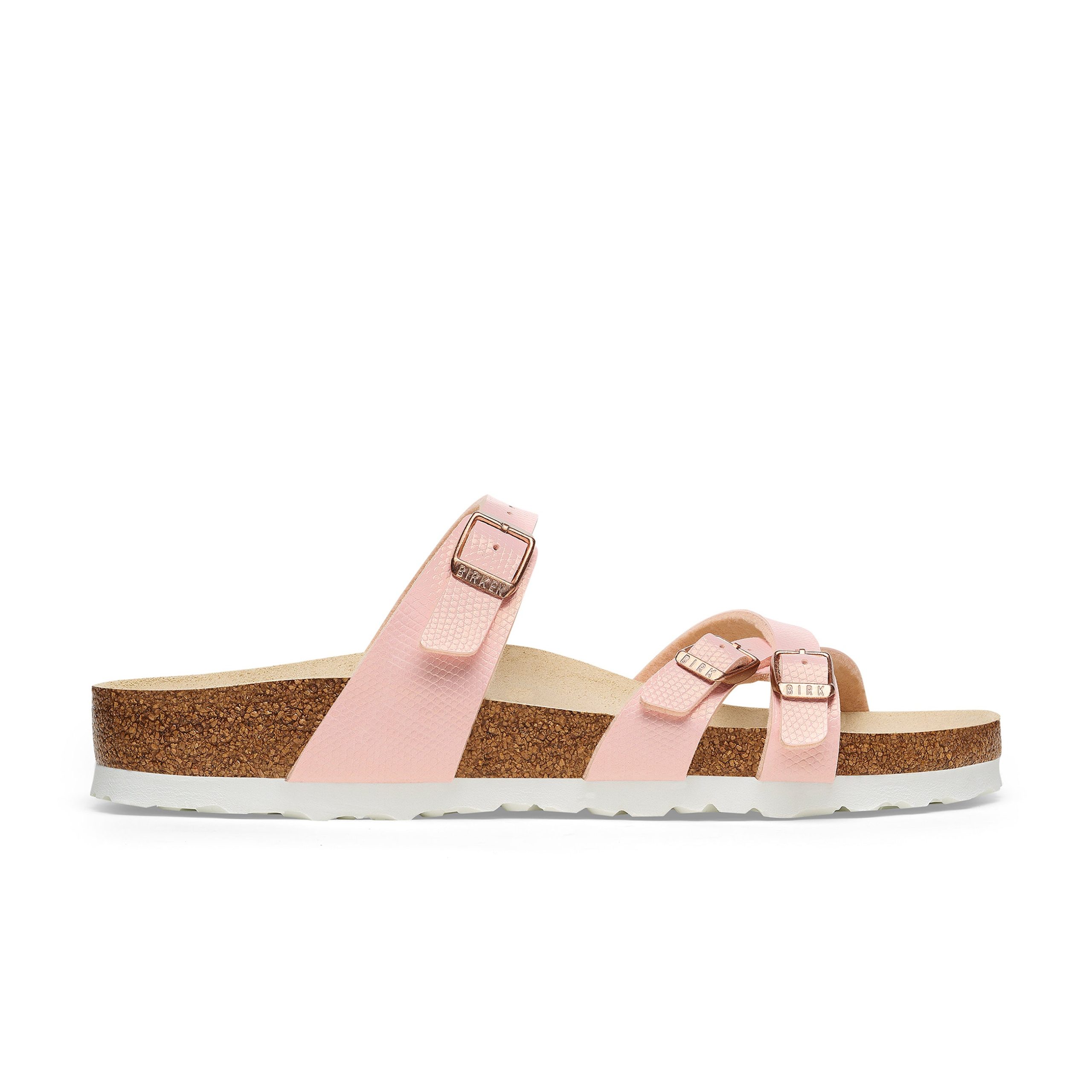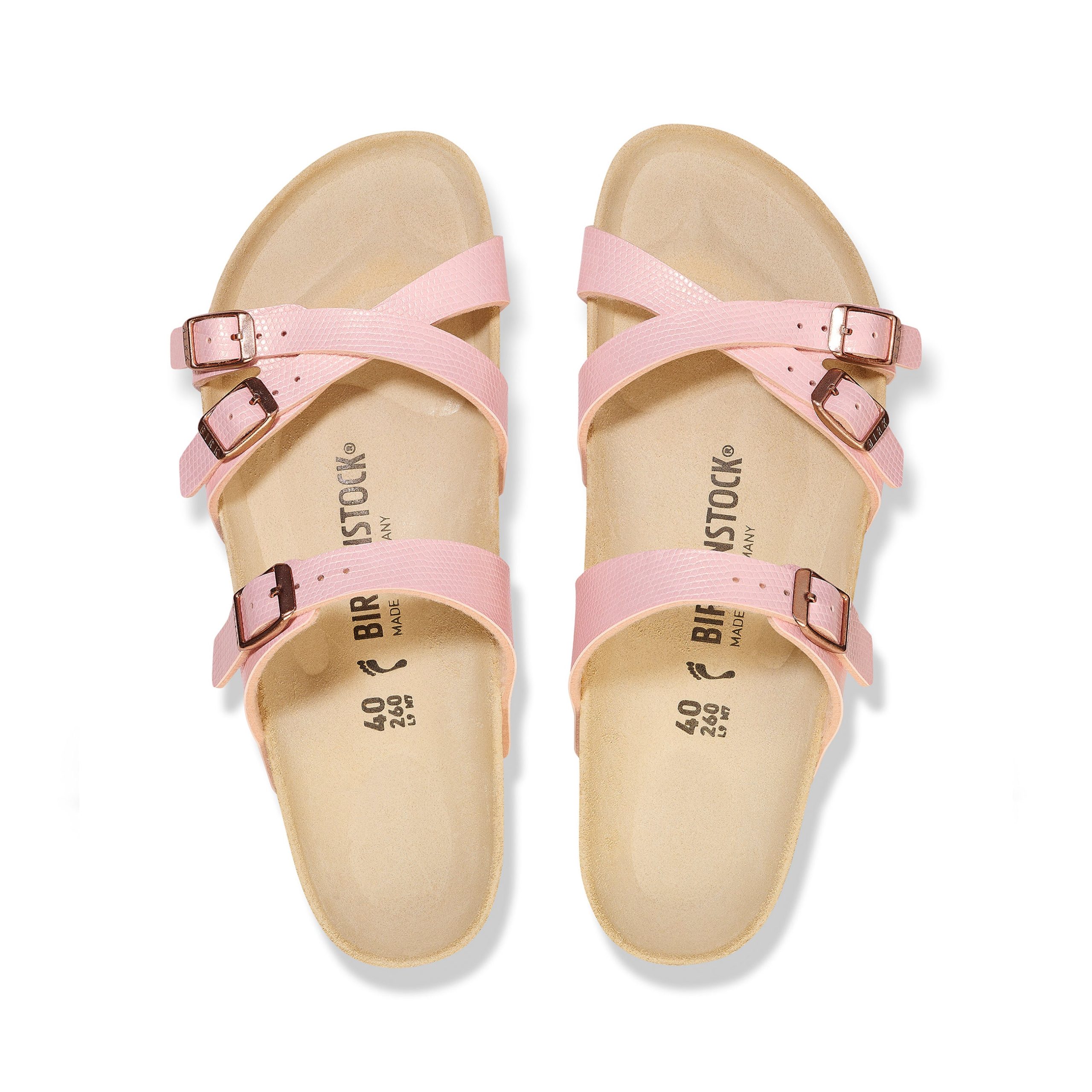 The Birkenstock Franca is an elegant model designed with slim. stylish crisscrossed straps. Featuring an impressive combination of design and wearability for all day comfort. Embossed. shimmery Birko-Flor brings subtle dimension to the strappy style.