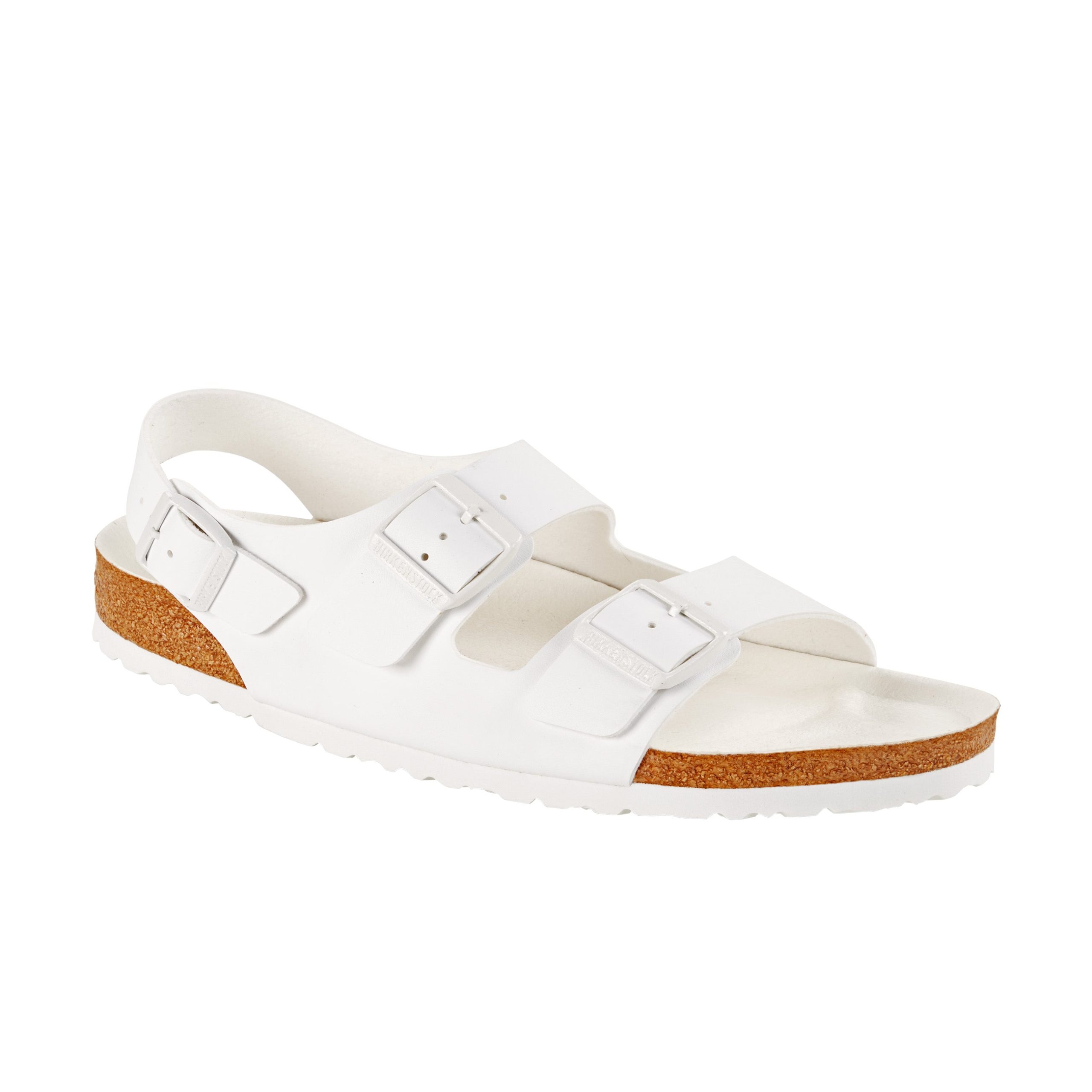 Add a heel strap to our iconic Arizona sandal and you get the Birkenstock Milano C a classic with added stability. The Milano back strap model gives you a secure step in any situation. whether you are at work or at play. Select materials and high-quality workmanship are complemented with the signature comfort of the Birkenstock footbed. The upper is made from the skin-friendly. hard-wearing synthetic material Birko-Flor. while the footbed features a microfibre lining.